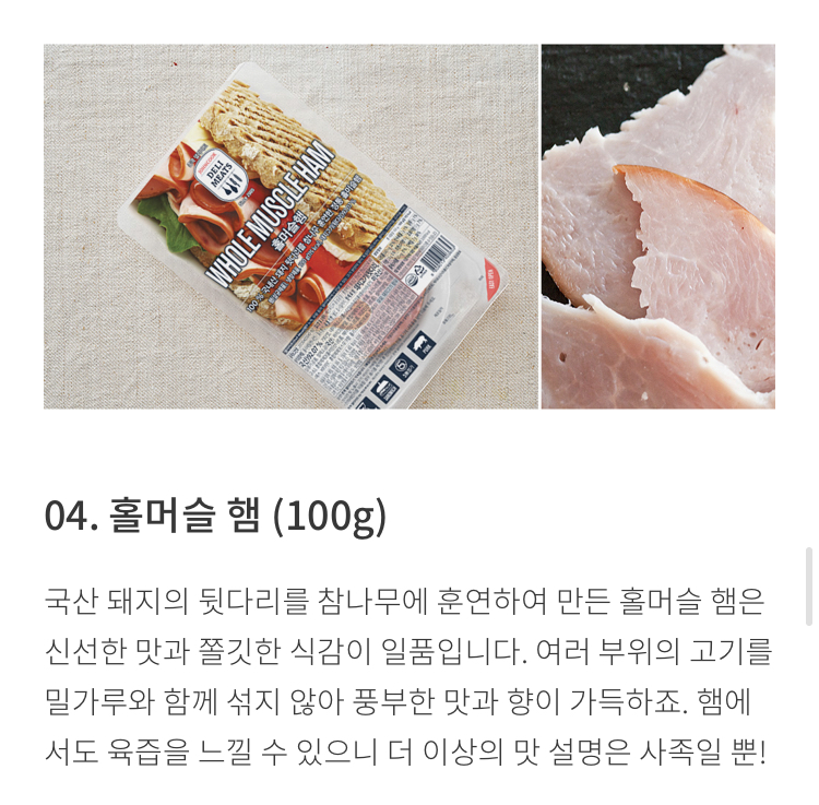 홀머슬햄 보다 쫀득한 느낌의 햄. 조금 짭짤하고 향신료 향이 나서 누린내는 안 나는!! 너무 만족스러운 햄이었다. 나는 이걸로 호밀식빵-모짜렐라치즈-비프 파스트라미2장-모짜렐라치즈-호밀식빵 순서로 샌드해서 파니니 만들듯이 팬에 눌러서 구워줬다. 치즈는 녹진하게 녹아내리고 햄은 짭짤해서 너무 맛있었다. 소스는 홀그레인으로 하면 더 맛있을듯 하다!